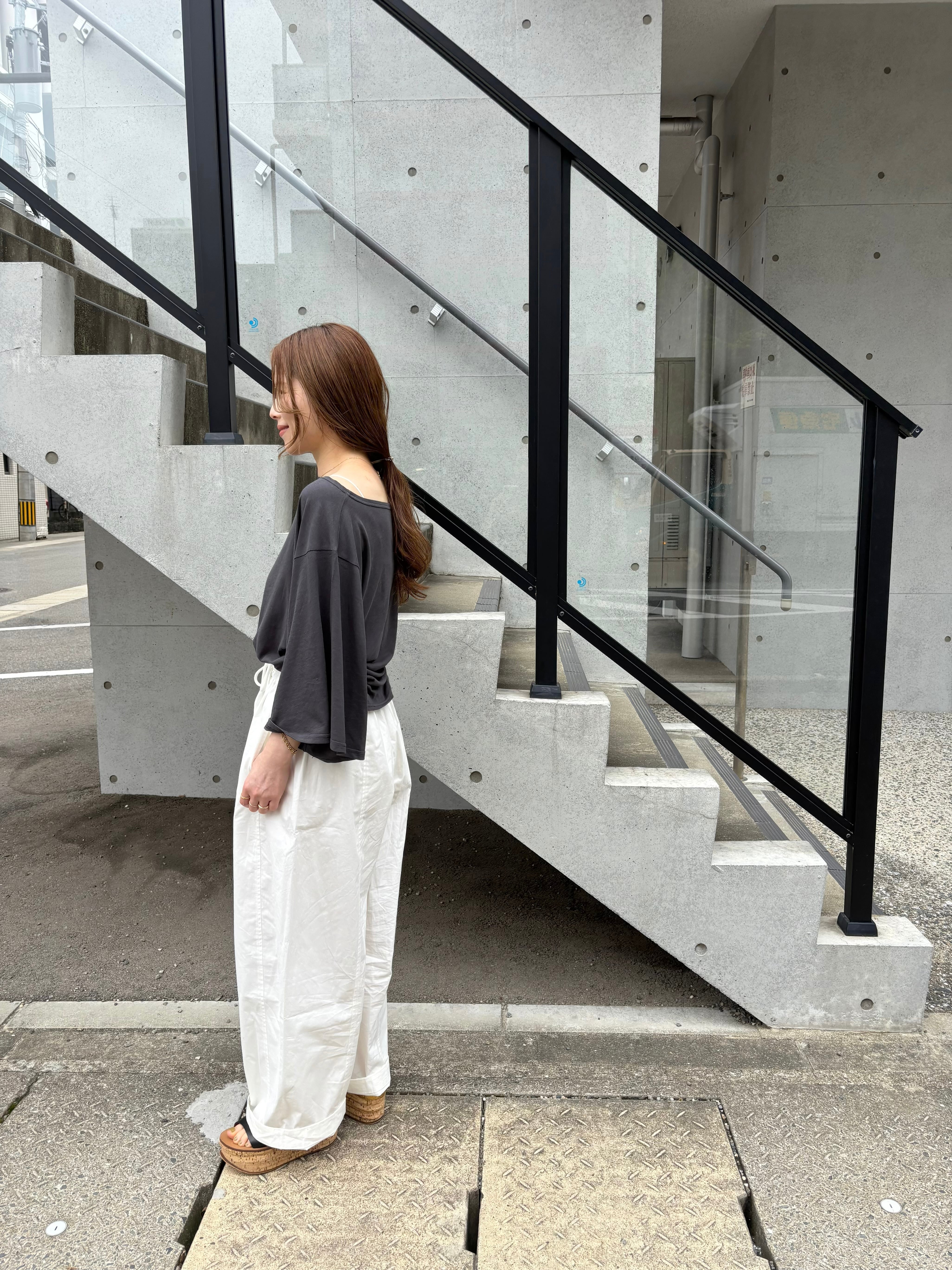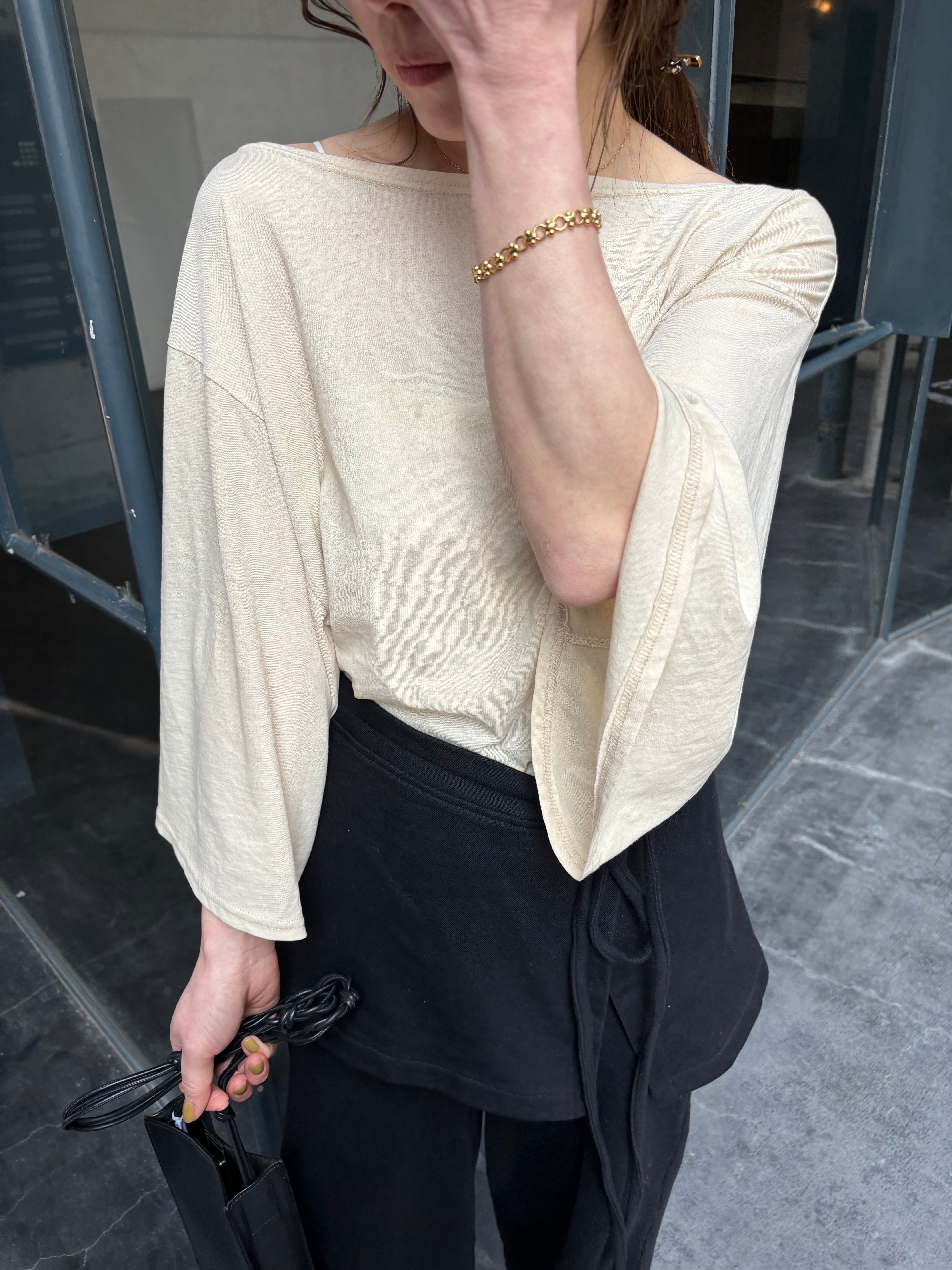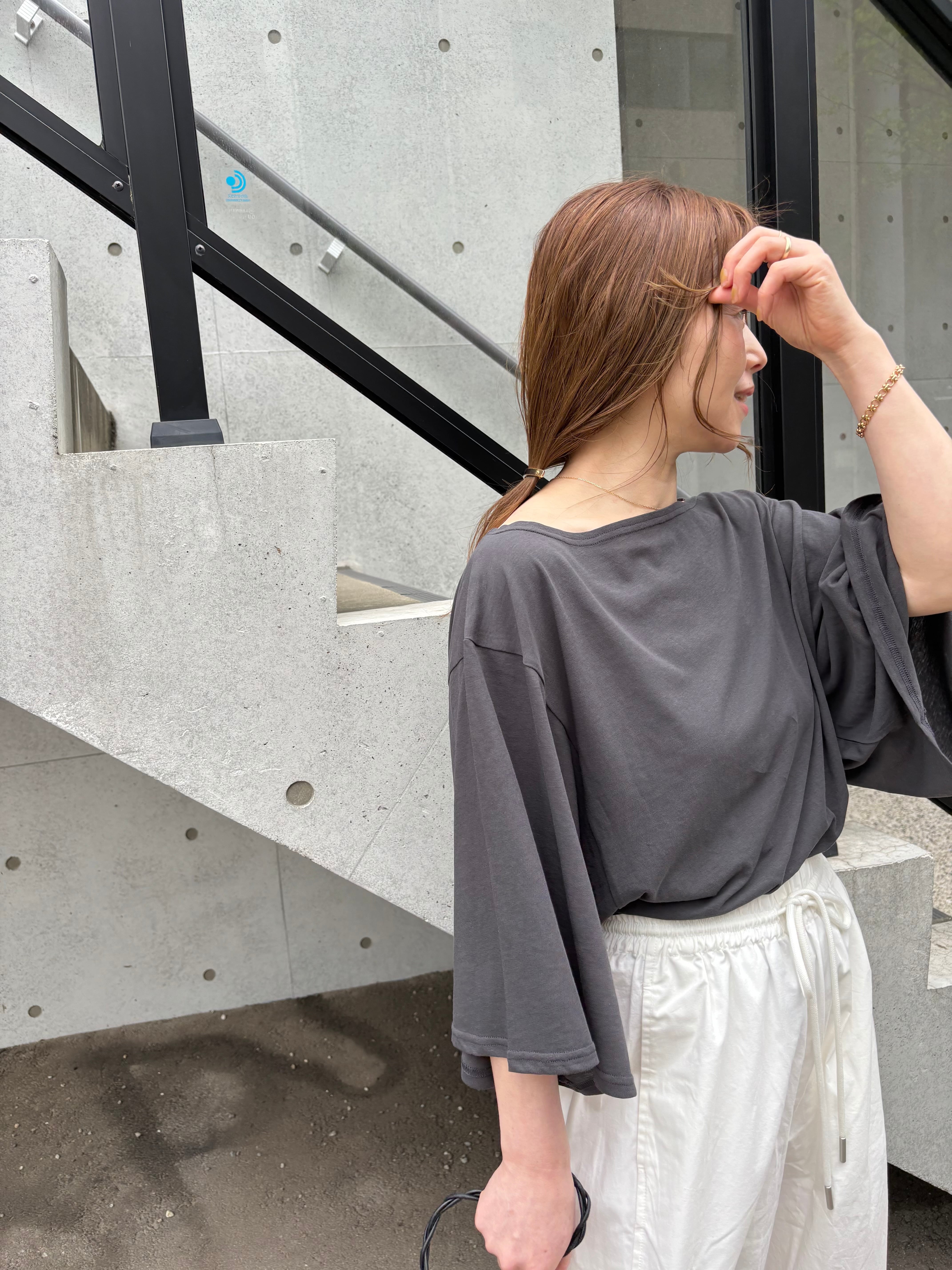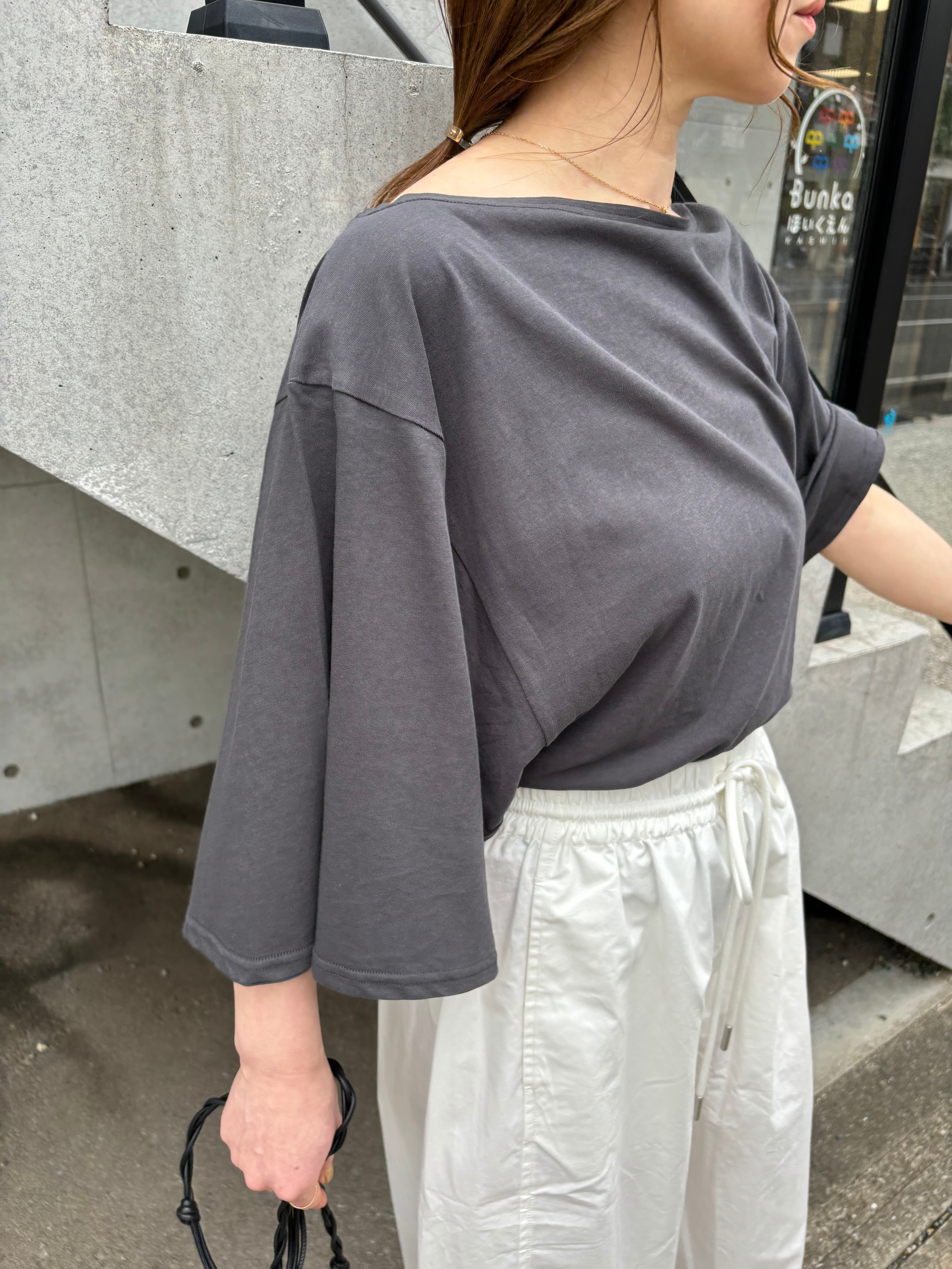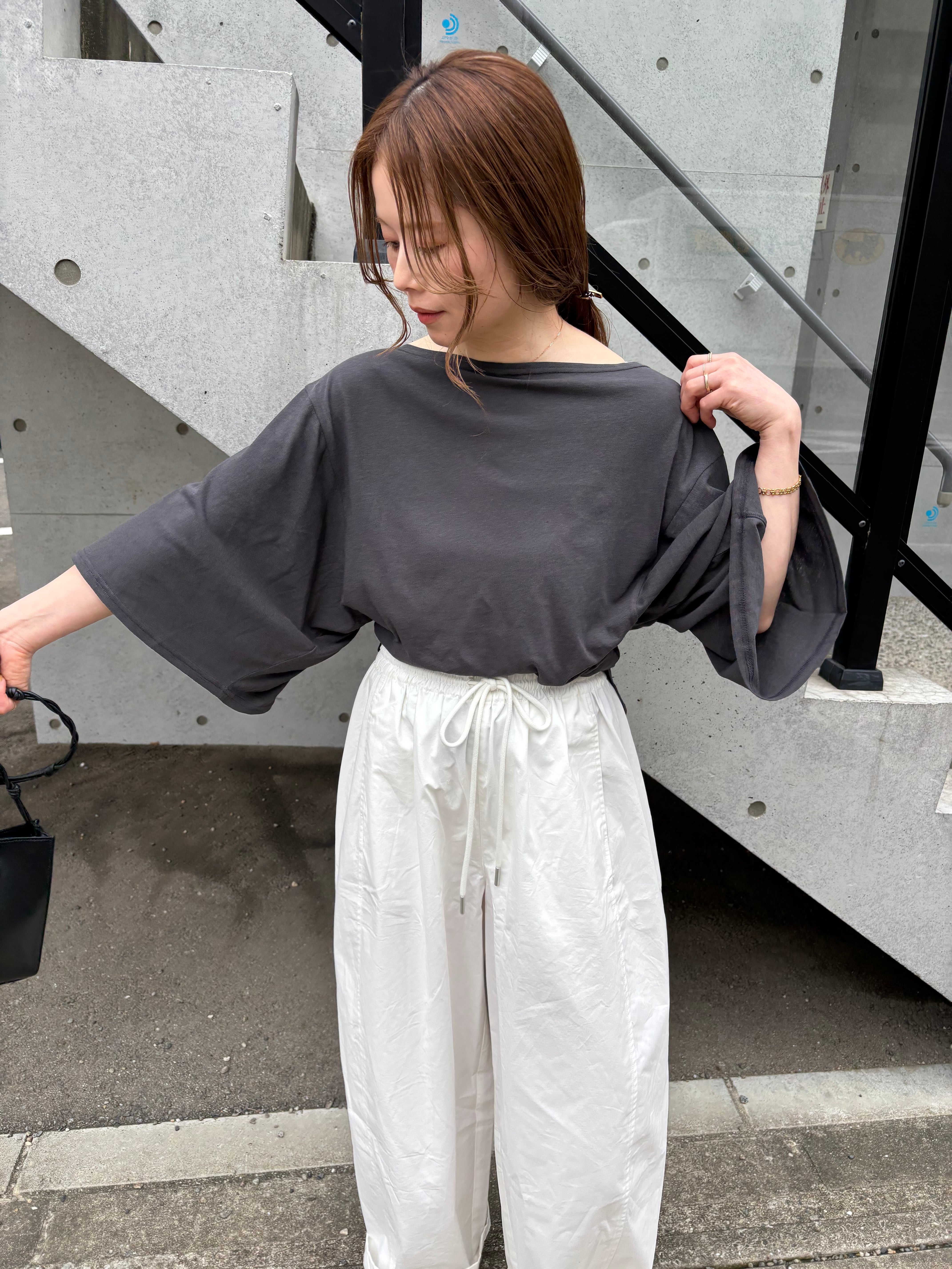 肩を落としたワンショルダーでのスタイリングも可能なので程よい抜け感も!違った雰囲気の着こなしも楽しめます。