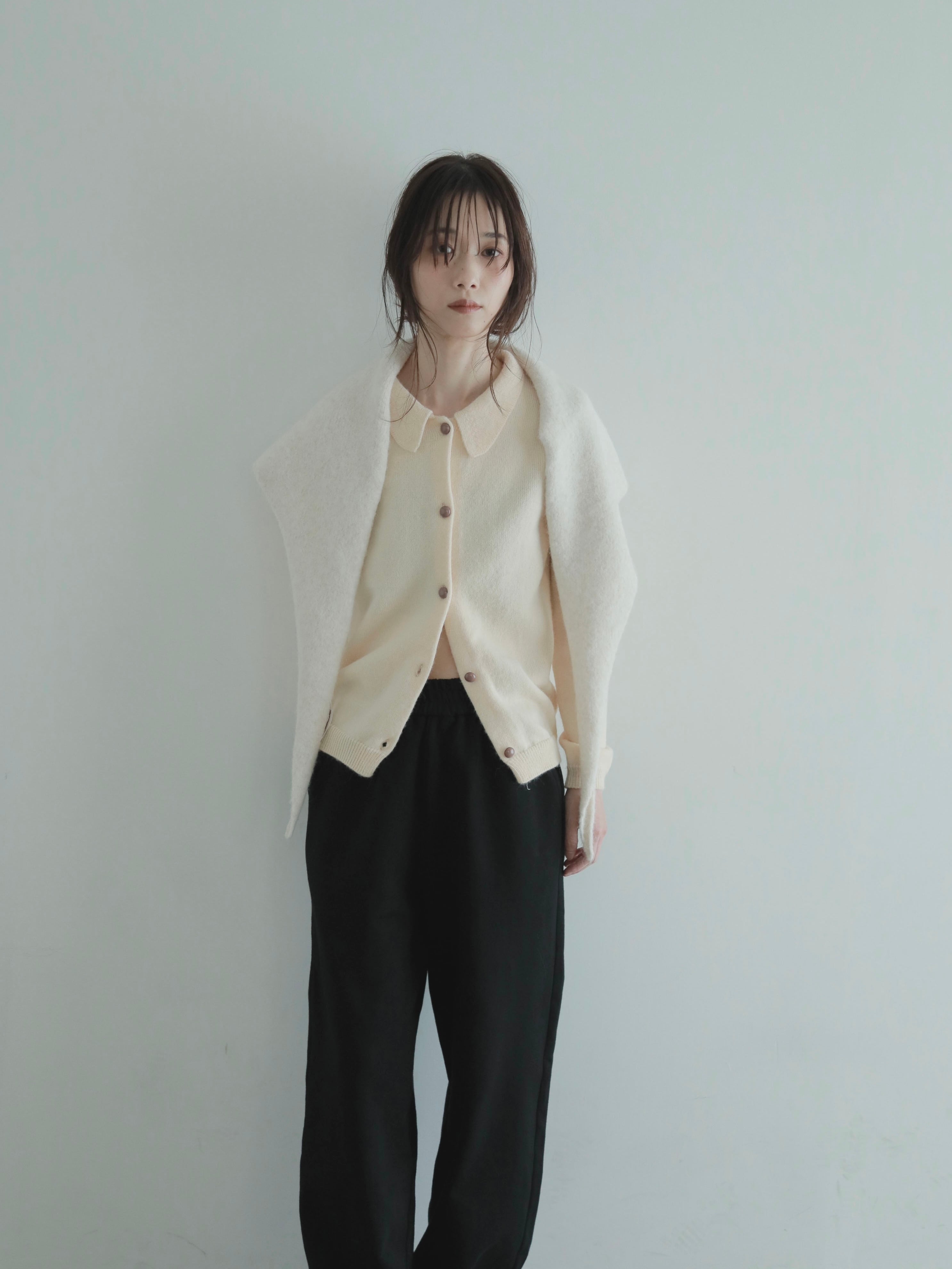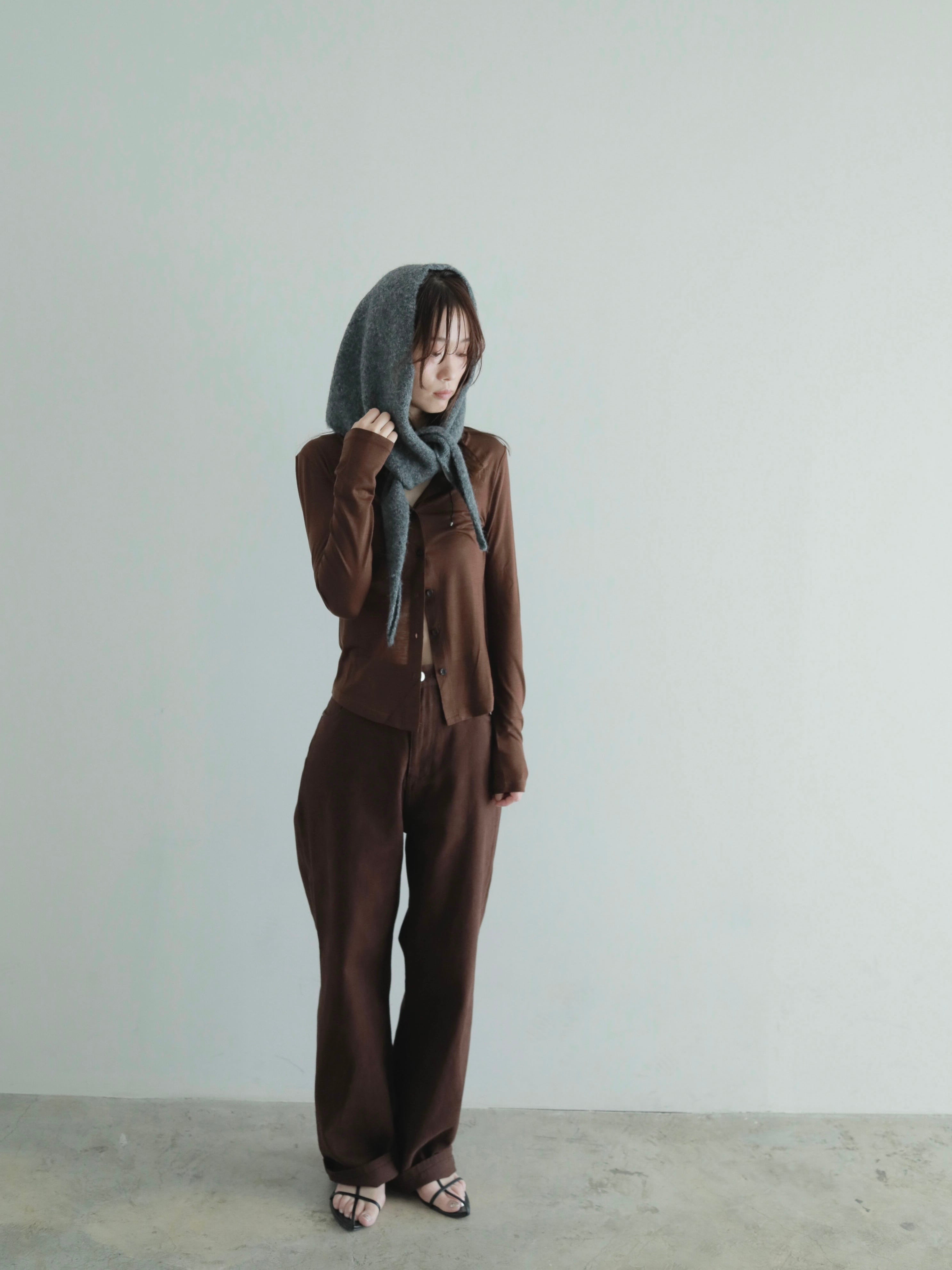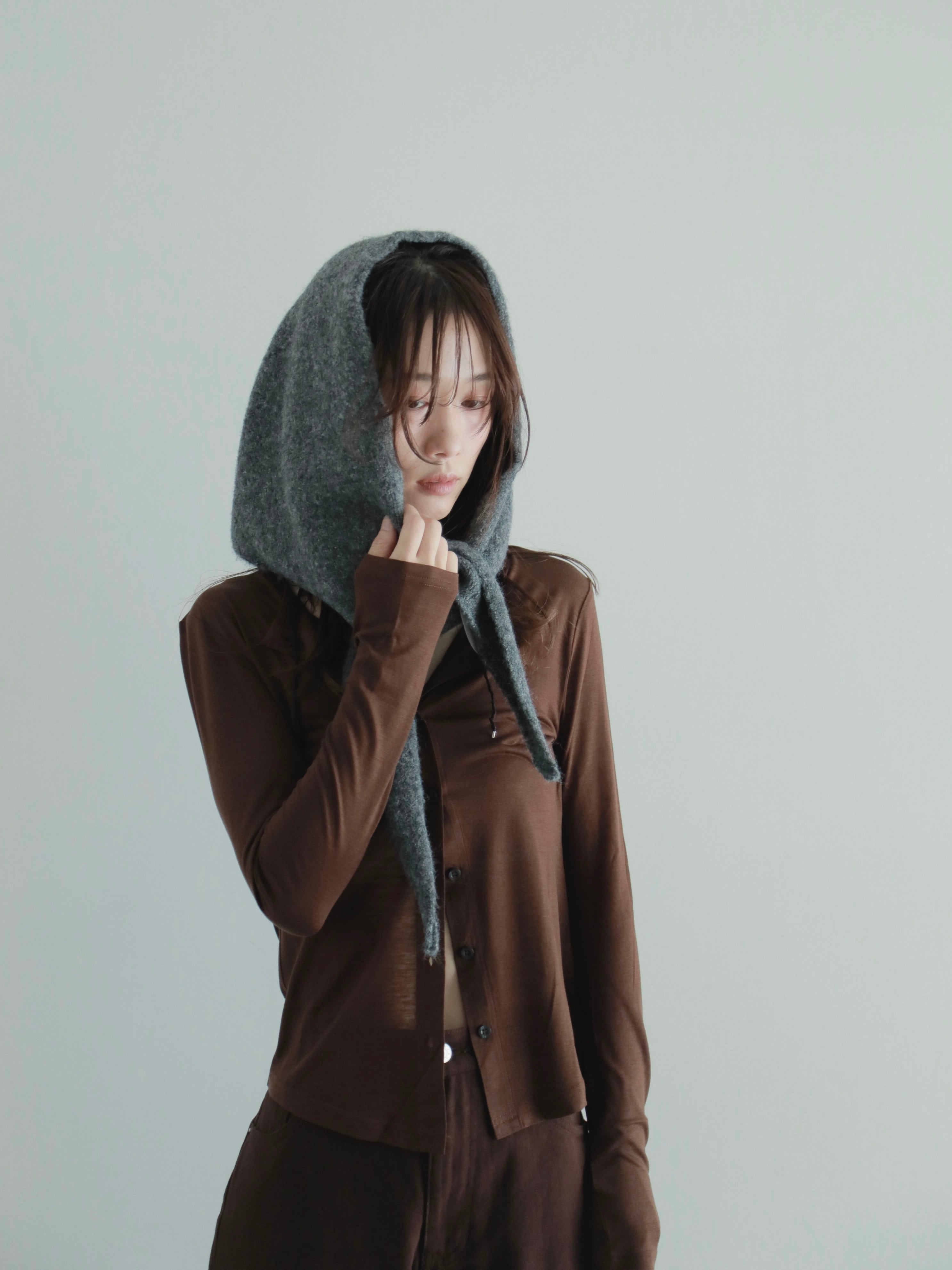オリジナルカラーで編み上げたニットスカーフ。色々な巻き方ができ、