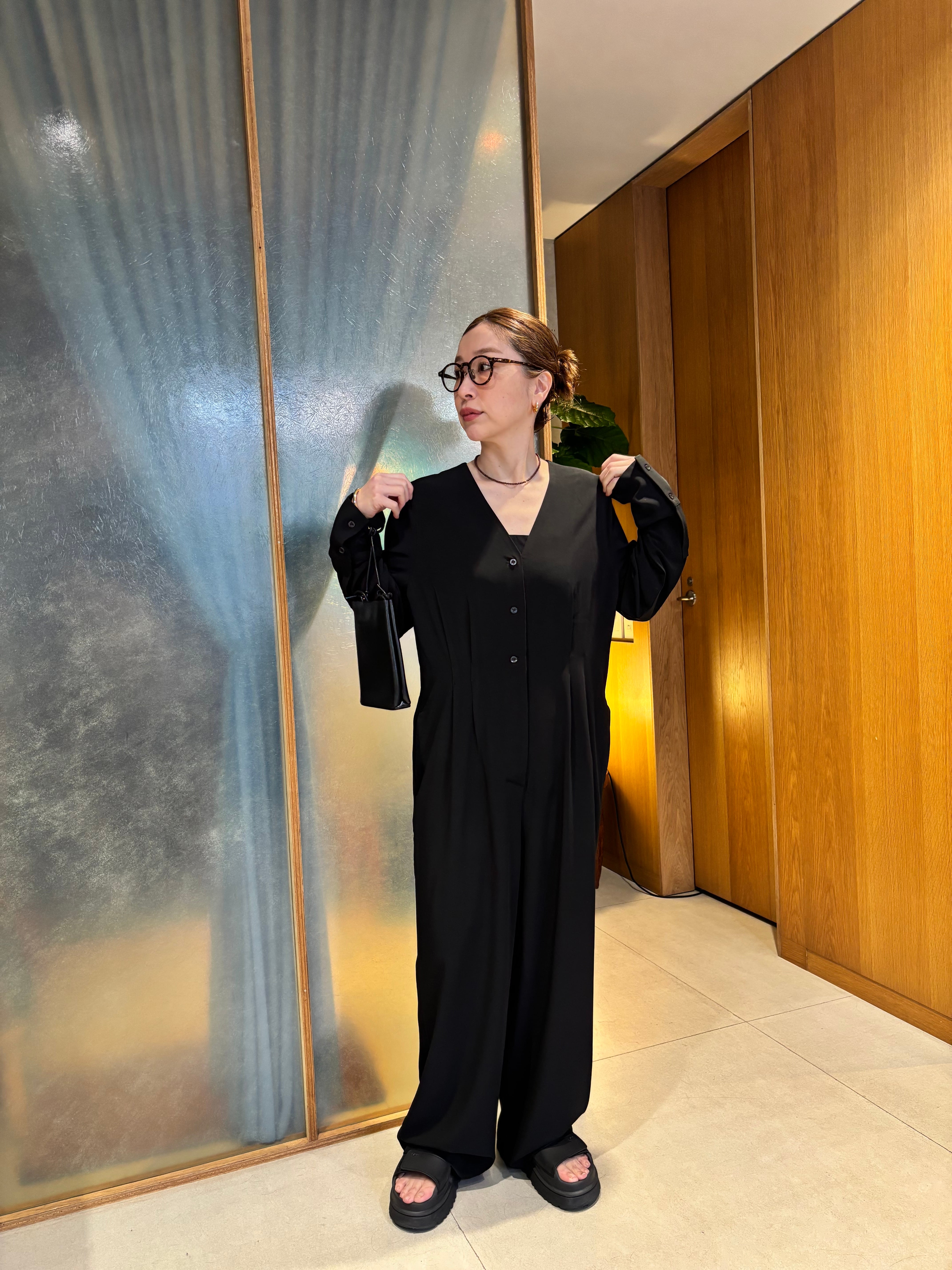 ツイル素材のきれいめな表情が一枚でさまになる大人の女性におぬすすめのジャンプスーツ。