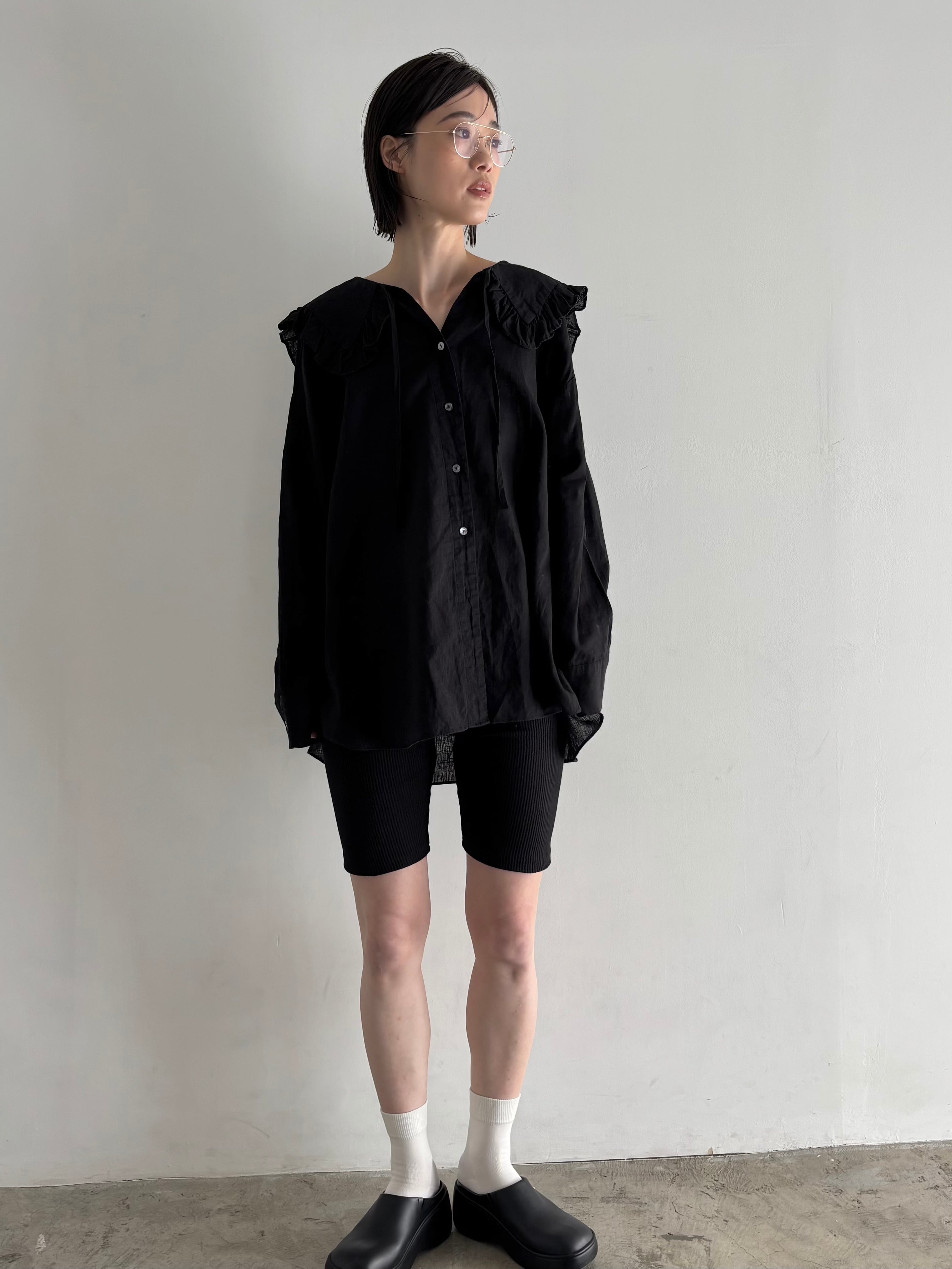 柔らかなコットンリネンを使用し、フリルカラーがポイントのブラウス。