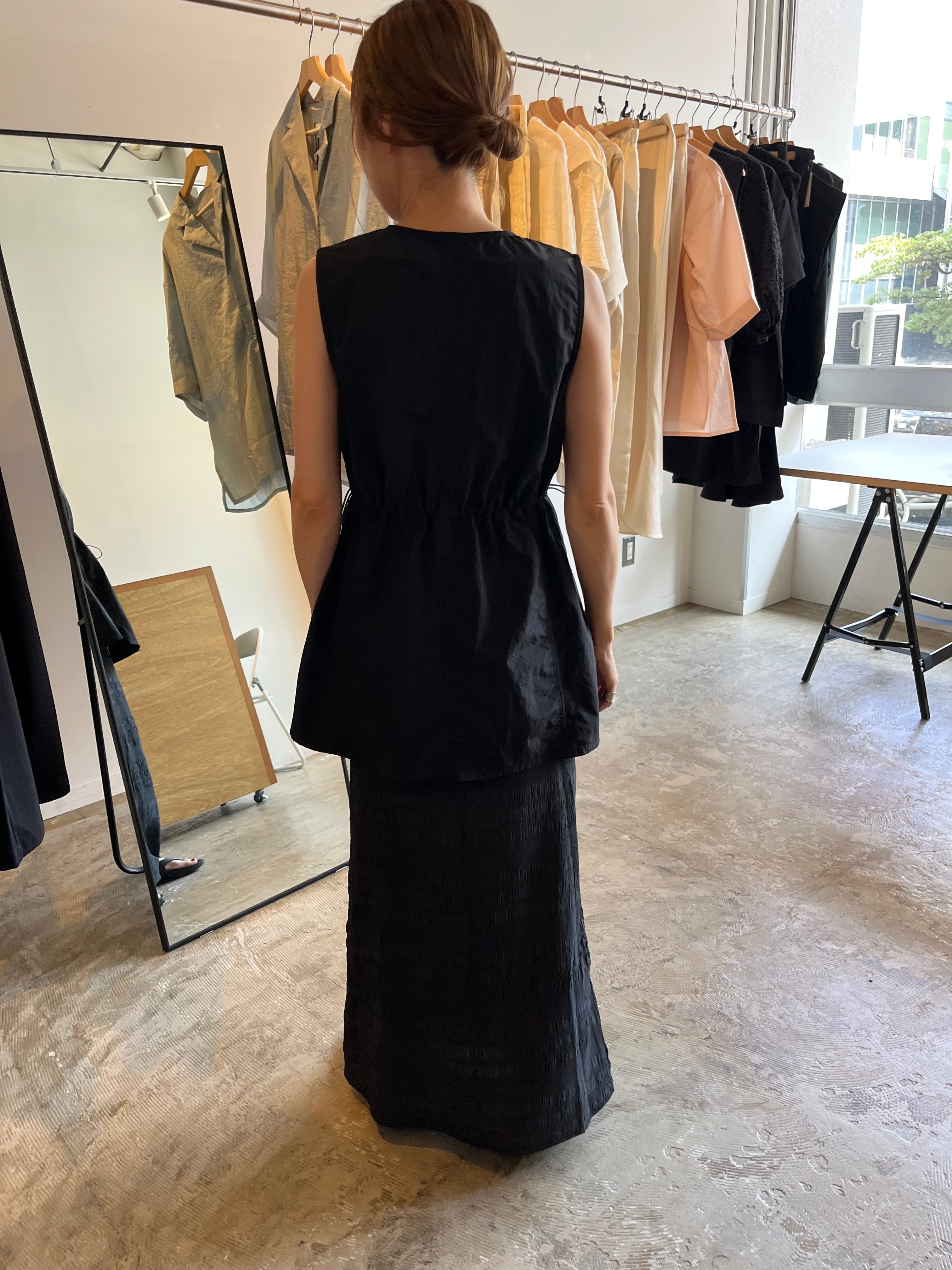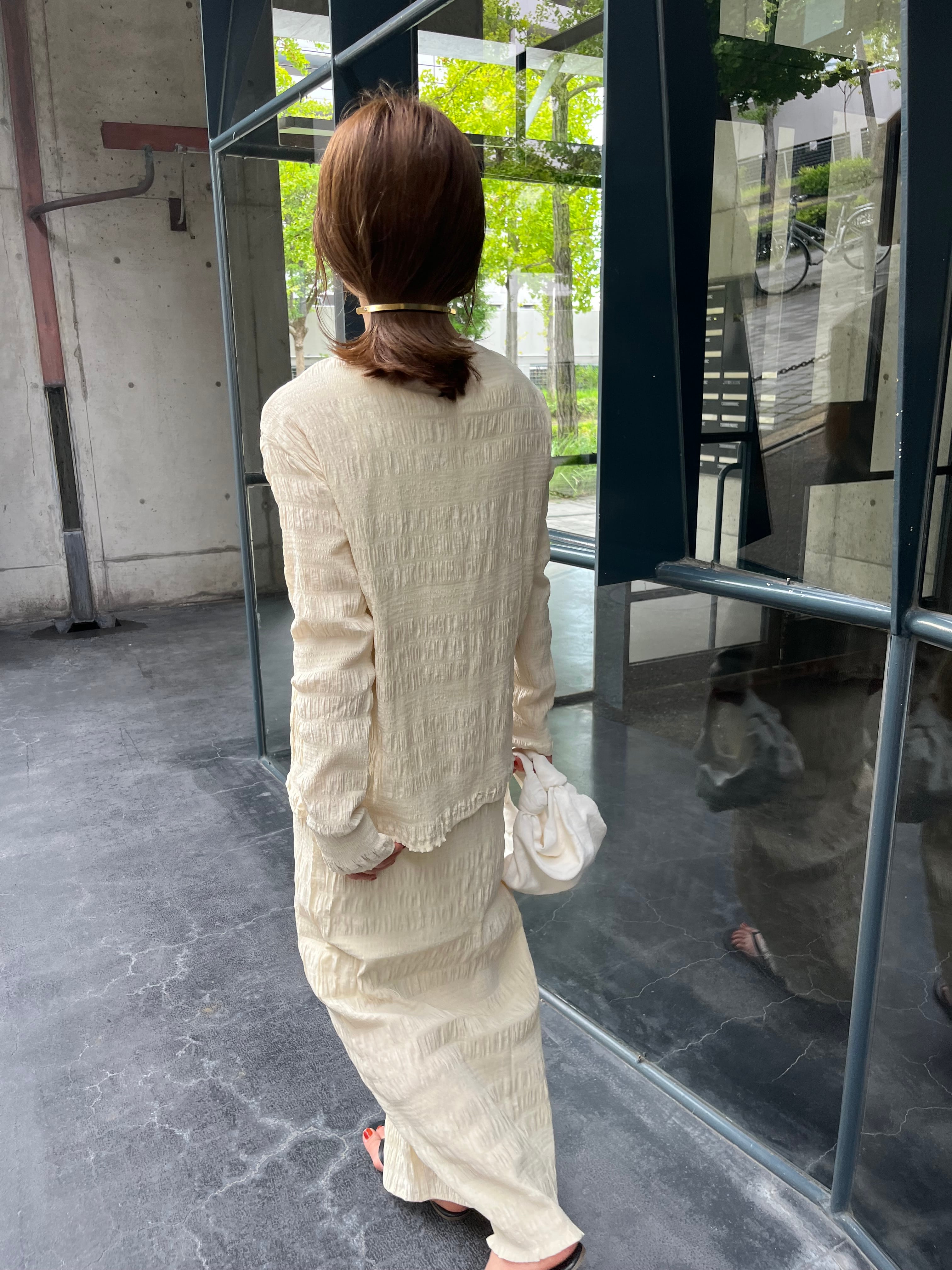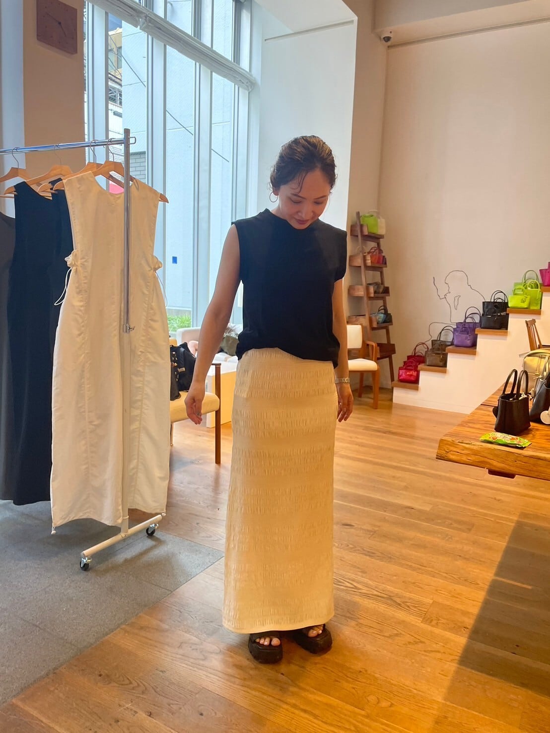 シャーリング生地を使ったロングスカート。伸びる素材なのでリラクシングな履き心地ながらも大人っぽいスタイリングに仕上げてくれる優秀スカート。