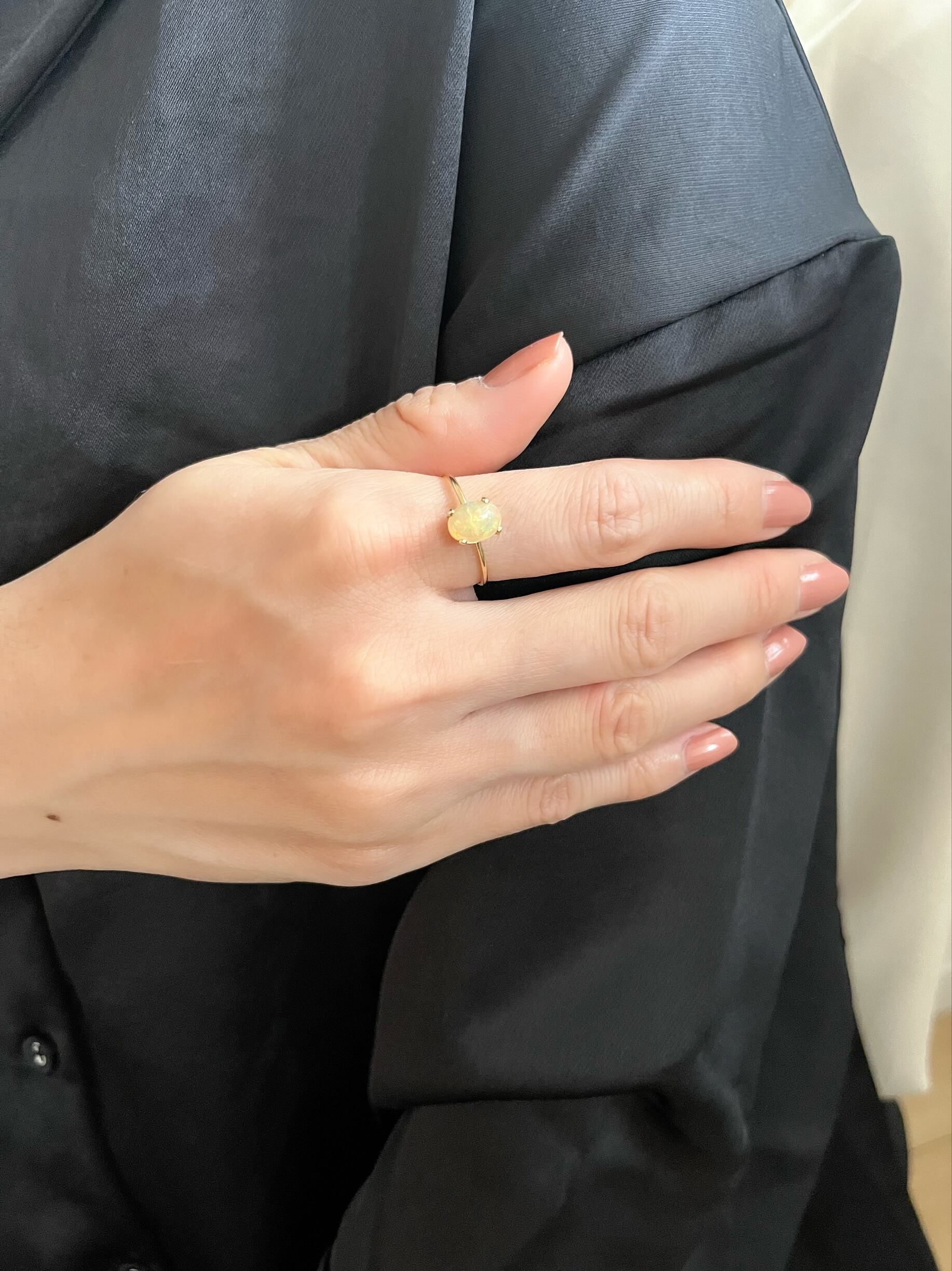 みる角度によって色の変化が楽しめる虹の様な美しさのオパール。光を集めるオーバルカットと程よいサイズ感が手を華やかに飾ってくれるリングです。