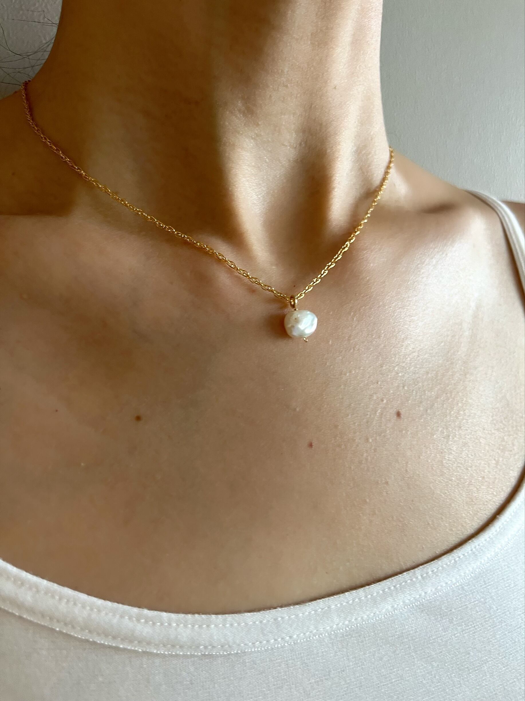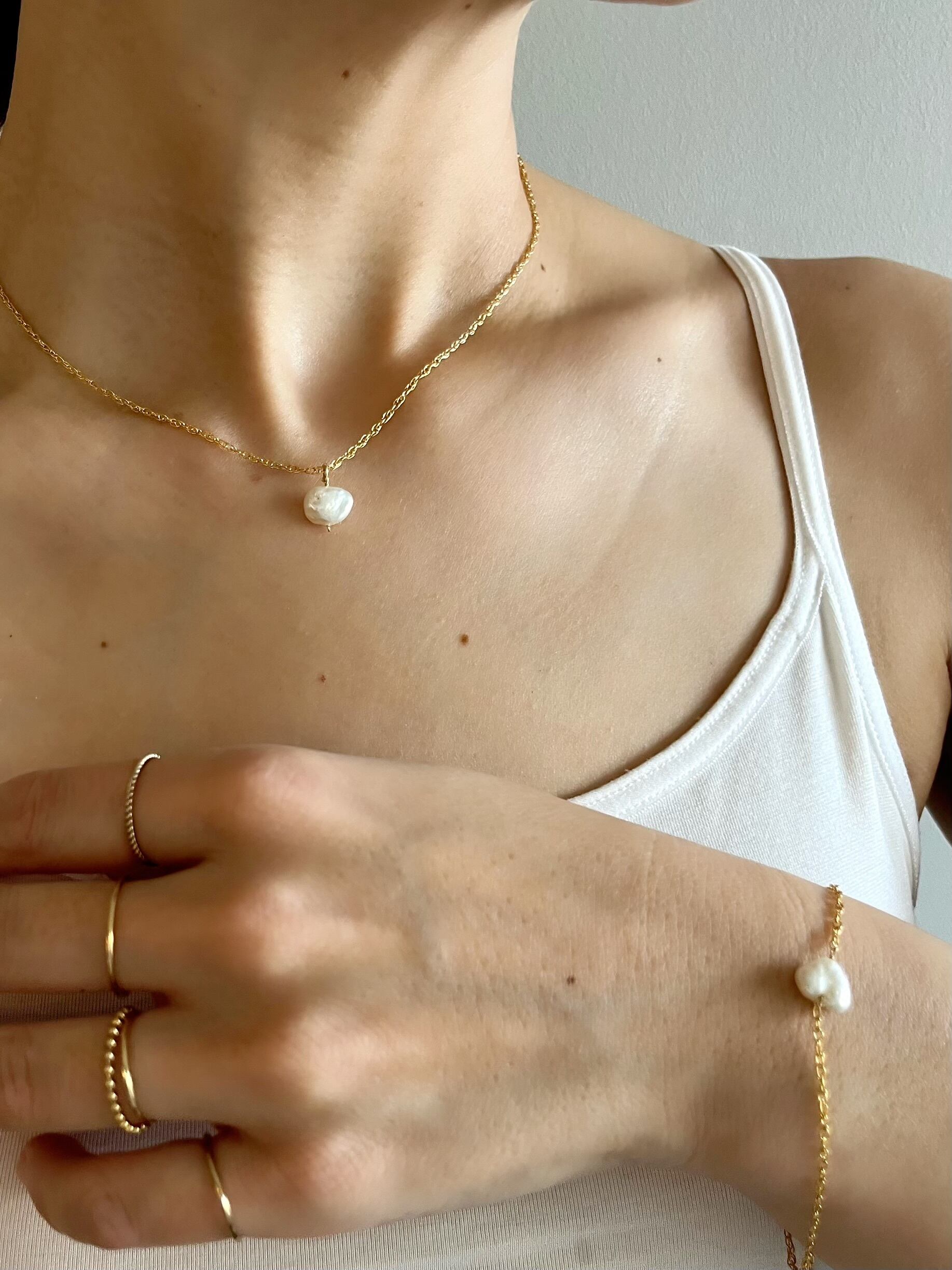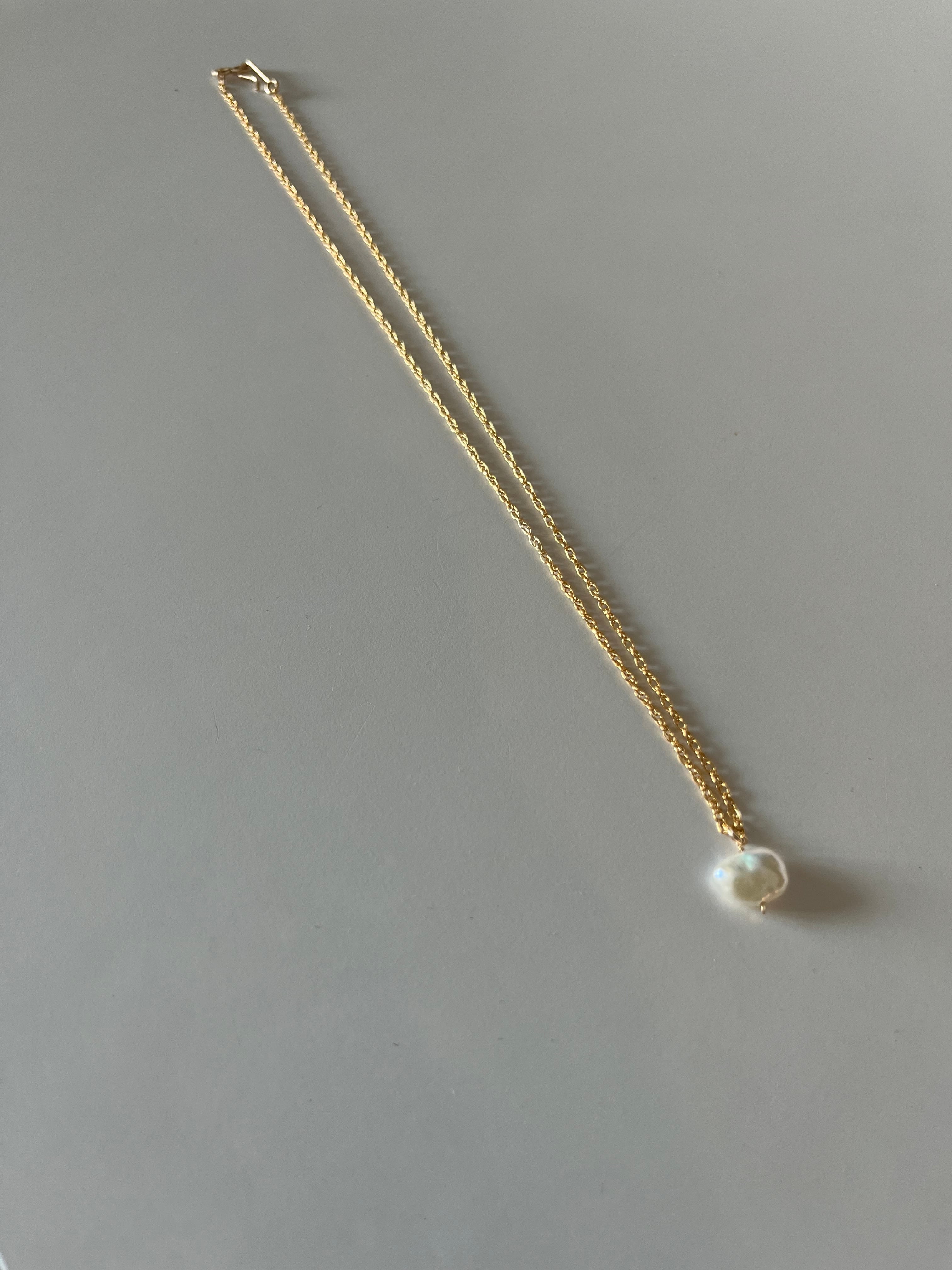 上品で華奢なロープチェーンに不規則な味わいのあるパールを組み合わせた上品なネックレス。