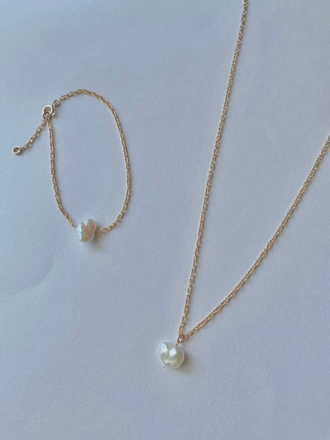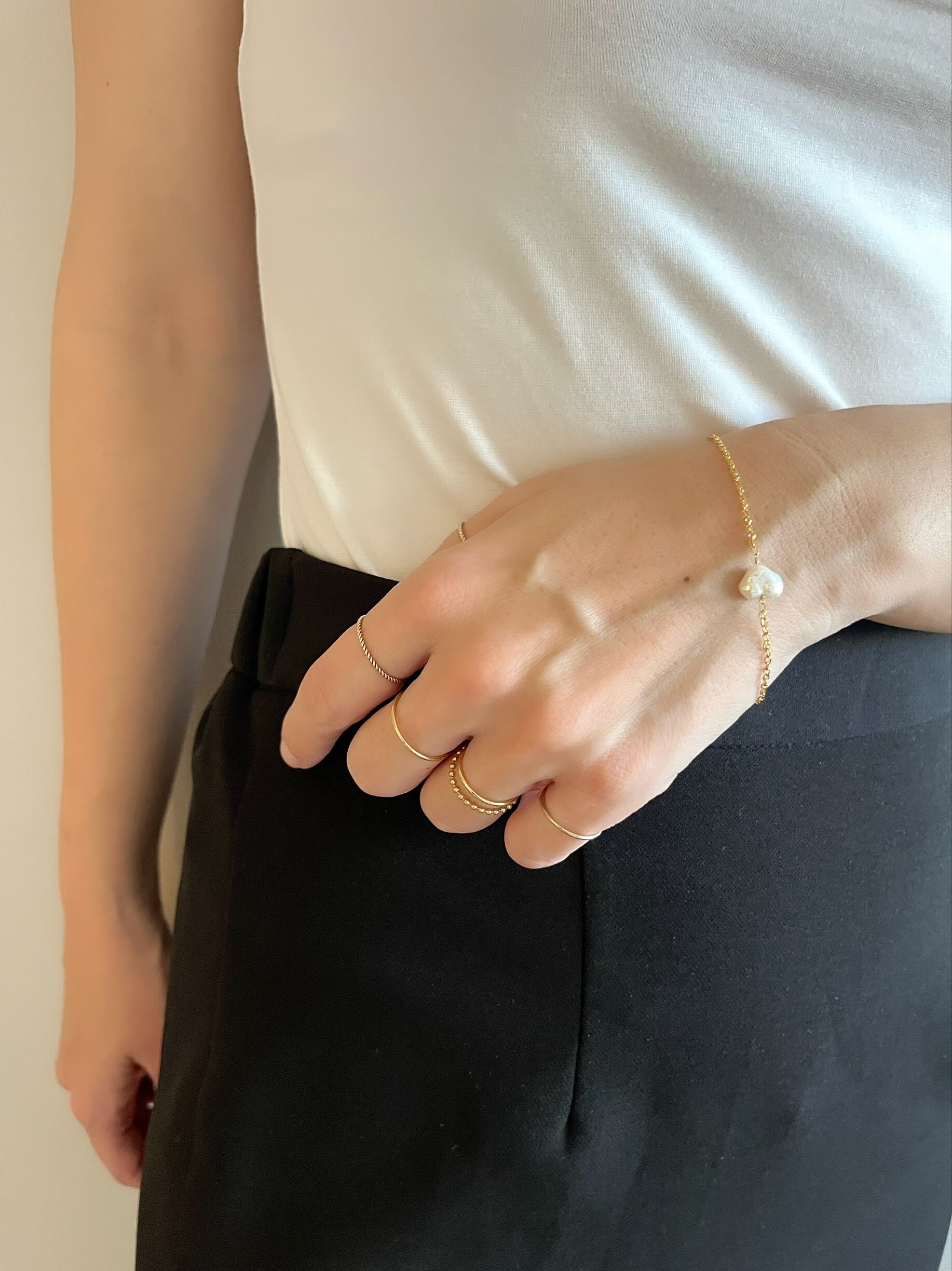 上品で華奢なロープチェーンに不規則な味わいのあるパールを組み合わせた上品なブレスレット。