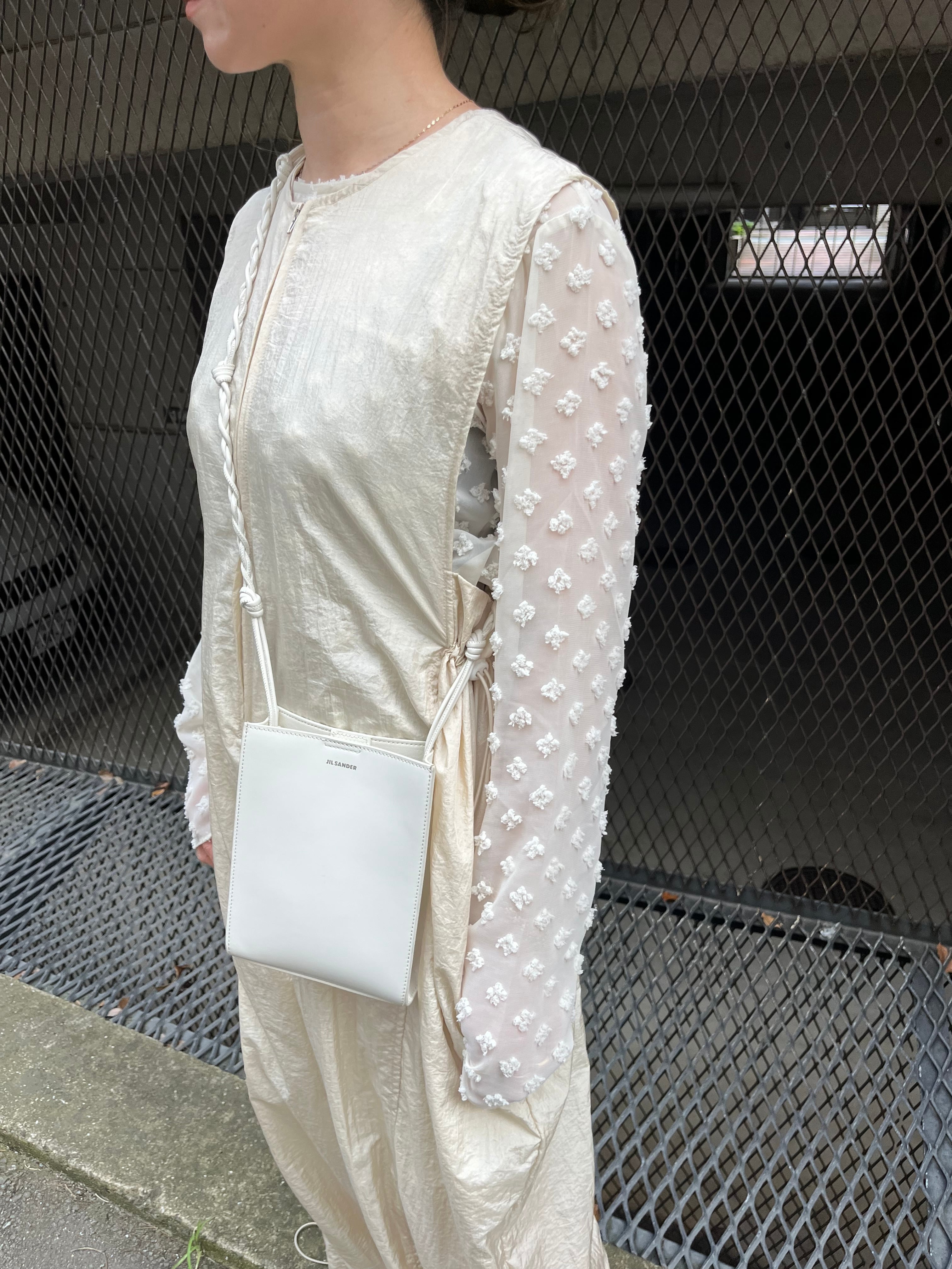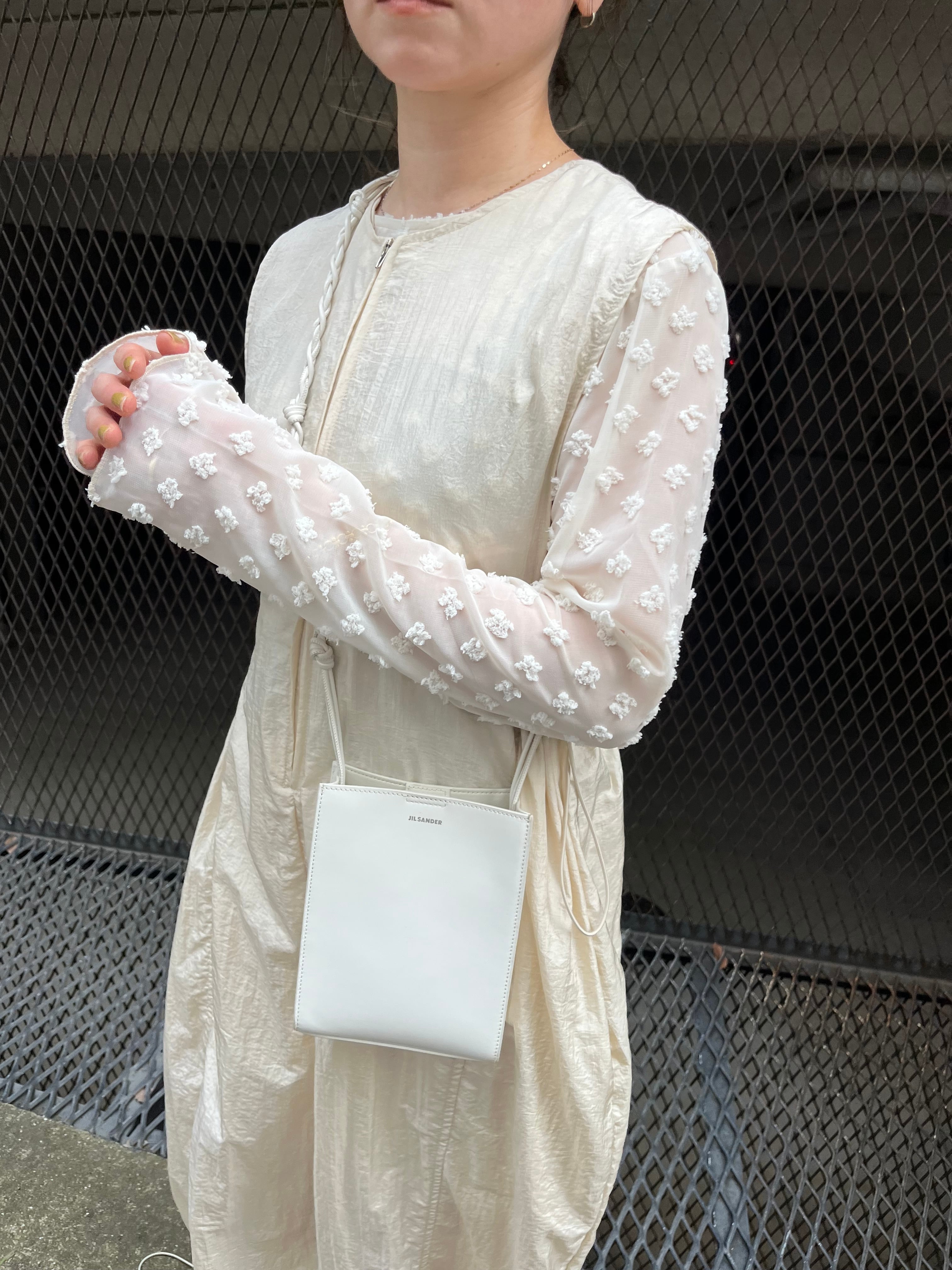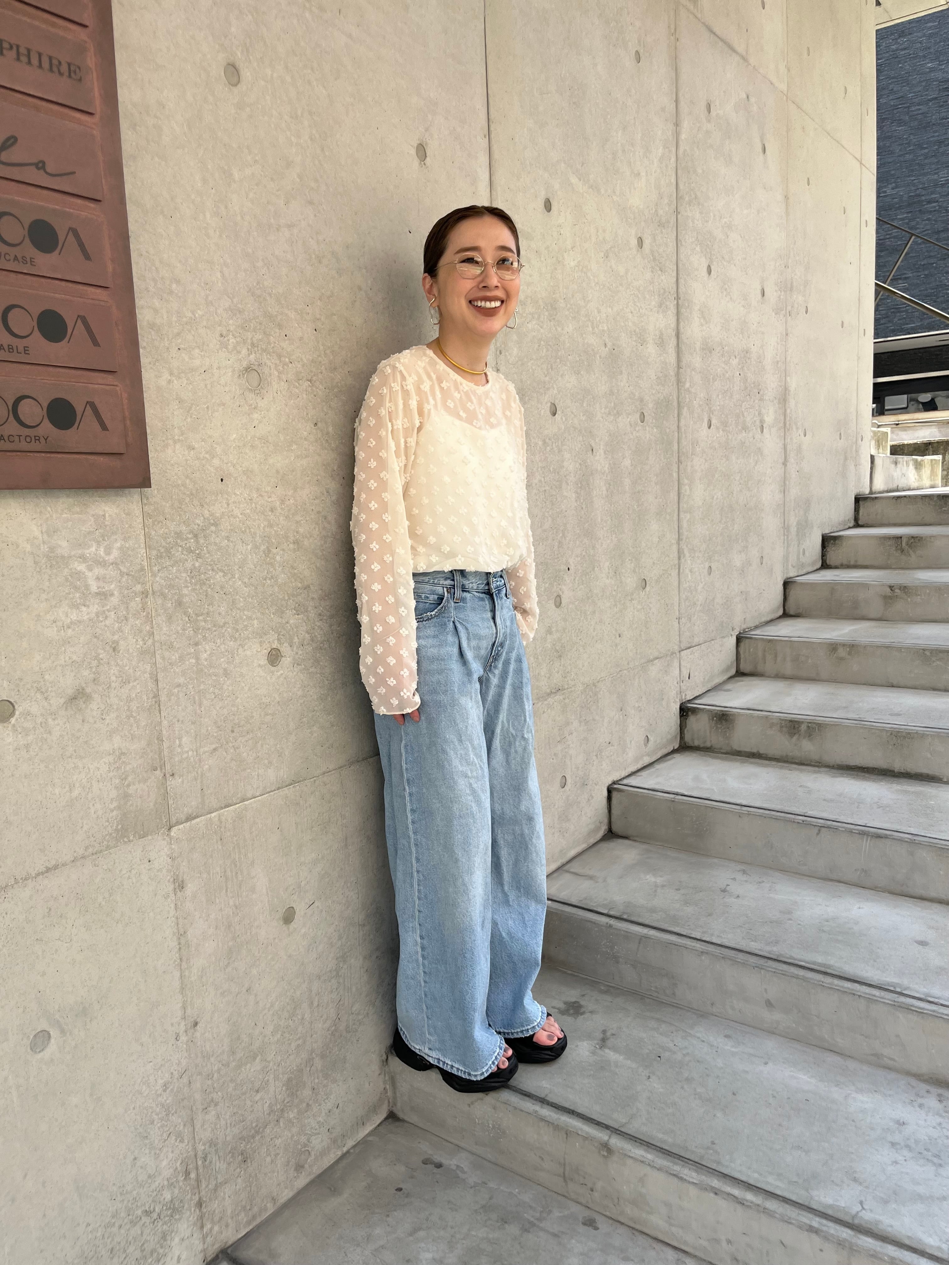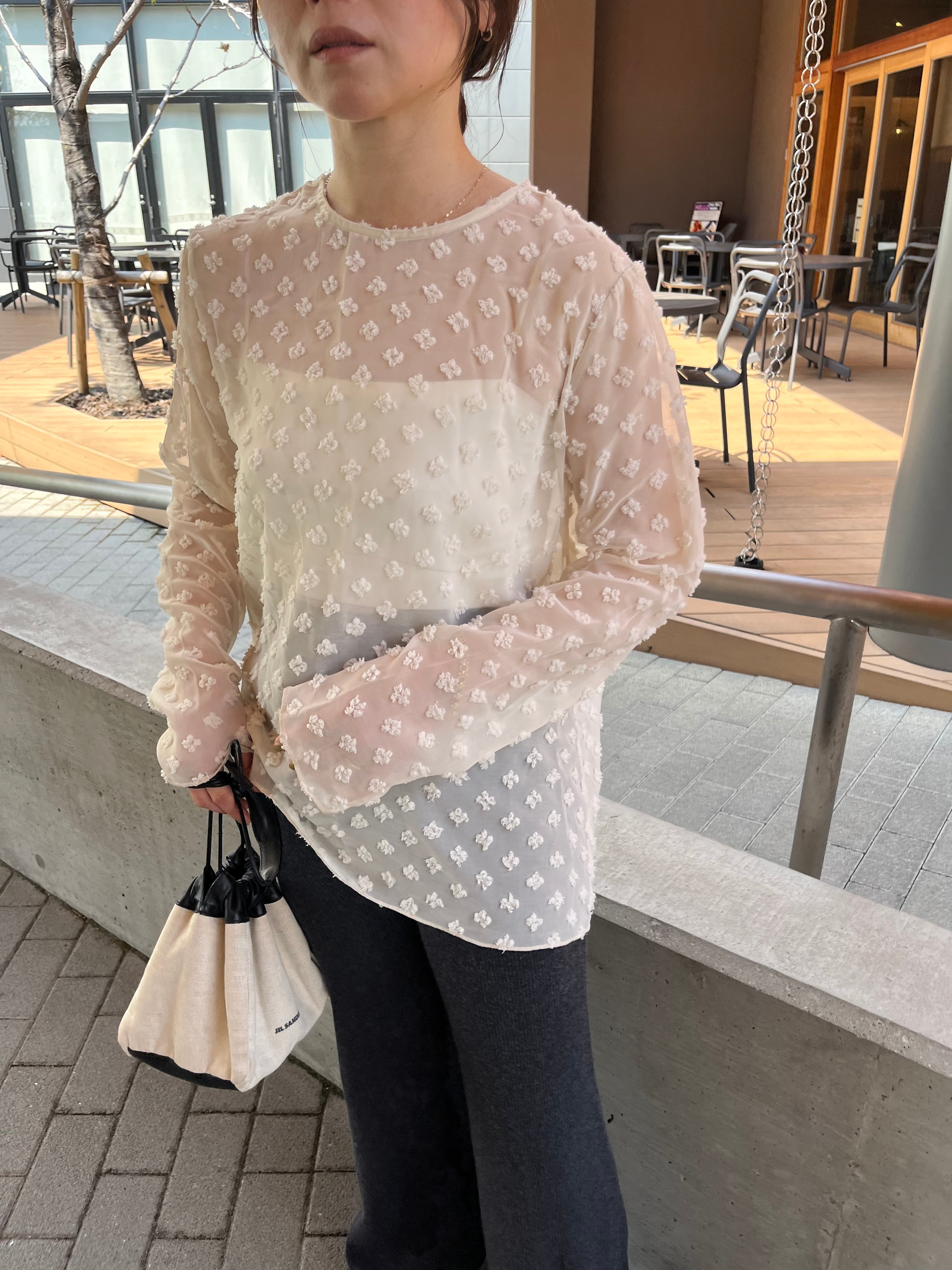 ふんわりした素材感が女性らしさを演出します。す透け過ぎない素材なので透け感が苦手な方も挑戦しやすいアイテム。体のラインを拾わず、透け感があるので華奢見えします。